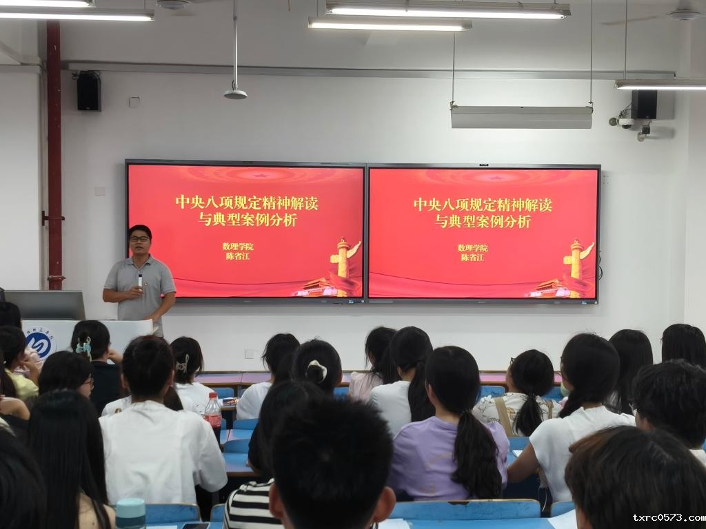 为扎实推进深入贯彻中央八项规定精神学习教育,进一步加强党的作风建设,6月10日-24日,数理学院党委书记邓兵,副院长关贵清,副院长、教师第一党支部书记陈省江,教师第二党支部书记刘鑫,学生第一党支部书记林丹丹,学生第二党支部书记林金森分别为师生党员讲授深入贯彻中央八项规定精神学习教育专题党课。